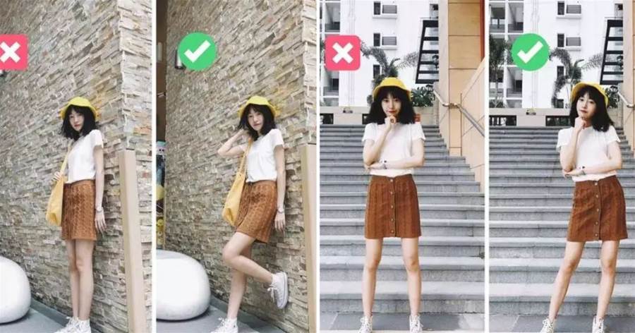 不要將兩隻腿站成同一水準線,前後腿交叉,會更顯腿長,如果再將鏡頭移到腰部位置從下往上拍,分分鐘180既視感。