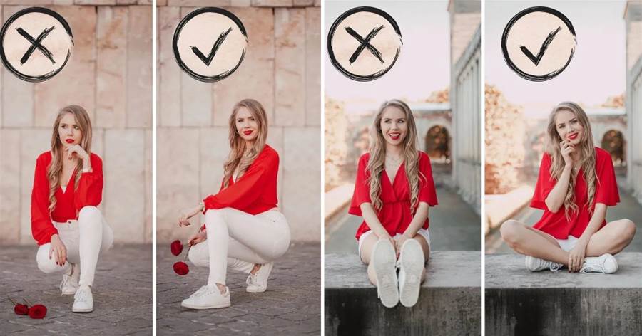 站著拍全身照的話,不要像左邊一樣雙腳並齊,也不要把手藏起來,可以讓兩隻腳自然交叉站立,然後手拿東西或者一手拉著裙擺,這樣微笑去拍照特別自然漂亮。