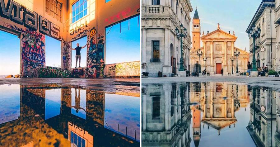 ②另外我們也可以專門拍攝水面倒影的部分,比如下方這張照片,水洼猶如一條小溪,將紅色的房子置入其中作為主體,給人一種城市間隙的創意感。