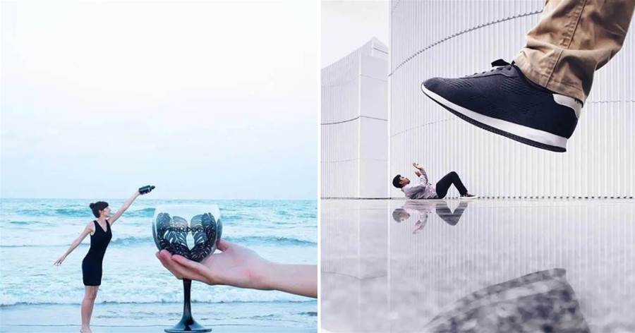 又或是,在海灘邊旅行時,偶遇長堤壩,利用錯位視角,將人物安排在堤壩的延伸處,以「吃」的動作姿態呈現出最終的畫面效果。